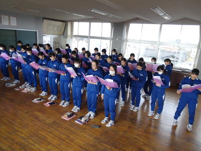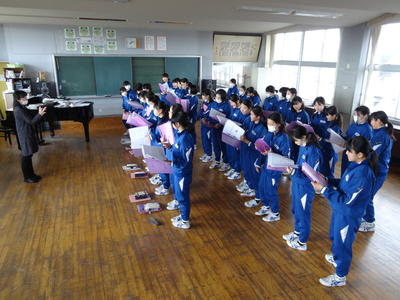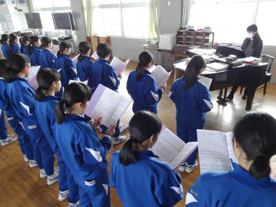 2月4日(月)から、3年生を送る会と卒業式に向けた合唱練習が始まりました。1・2年生は「明日の空へ」、3年生は「遥か」と「旅立ちの日に」、そして全校生で「大地讃頌」を歌います。昼休みや放課後の短時間の練習ですが、全員の気持ちを一つにし、素晴らしい合唱になることを期待します。