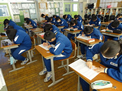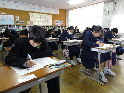 12月20日(木)1・2年生対象に第2回実力テストを行いました。生徒たちは2学期最後の大切なテストと位置づけて計画的にテスト勉強を進めてきました。本日は朝学習の時間や休み時間も惜しんで教科書や参考書に目を通してテストに備えていました。テスト終了後は、渡された「模範解答と解説」に目を通し一喜一憂していました。必ずテストの振り返りをするとともに理解不十分な箇所は解説を読むなどして理解を深めましょう。