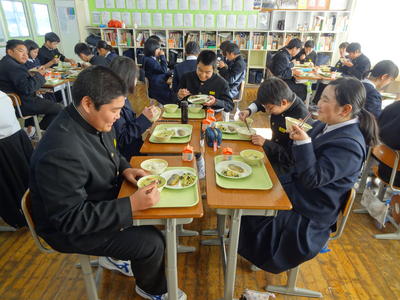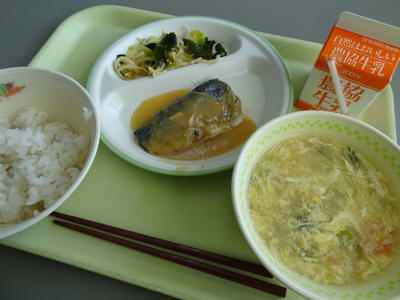 12月18日(火)、本日の給食は「食育の日・和食献立」でした。メニューは、麦ごはん・牛乳・さばのみそ煮・もやしのおひたし・かきたま汁でした。昼の放送で、「おひたし」の話があり、たっぷりのお湯で野菜をゆでた後、さらに水にさらしたり、洗ったりする調理方法は、世界的にめずらしく、水が豊富で良質だからできる日本ならではの調理方法だそうです。放送を聞いた生徒たちは、和食に感謝して味わいながら食べていました。