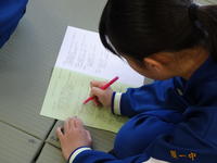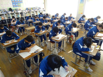 12月12日(水)6校時、スペリングコンテストを行いました。英語科から前もって渡された問題の中から、全学年共通問題50問・各学年独自の問題50問・合計100問が出題され、生徒たちは満点を目指してテストに挑みました。また、どのクラスでも学級平均点がどれぐらいになるかも興味津々でいます。結果が楽しみです。