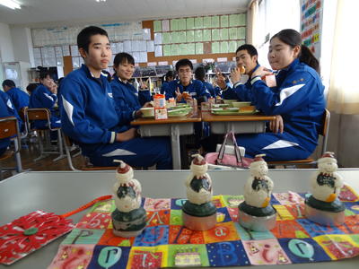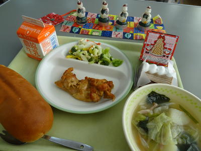 12月19日(水)の給食は昨日に続き特別行事給食で、生徒たちが楽しみにしていたクリスマス献立でした。メニューは、減量ミルクパン・牛乳・プチケーキ・タンドリーチキン・モミの木サラダ・コンソメスープが出ました。生徒たちは生活班毎に美味しい給食を味わいながら会話もはずみ、たっぷりクリスマス気分を味わっていました。