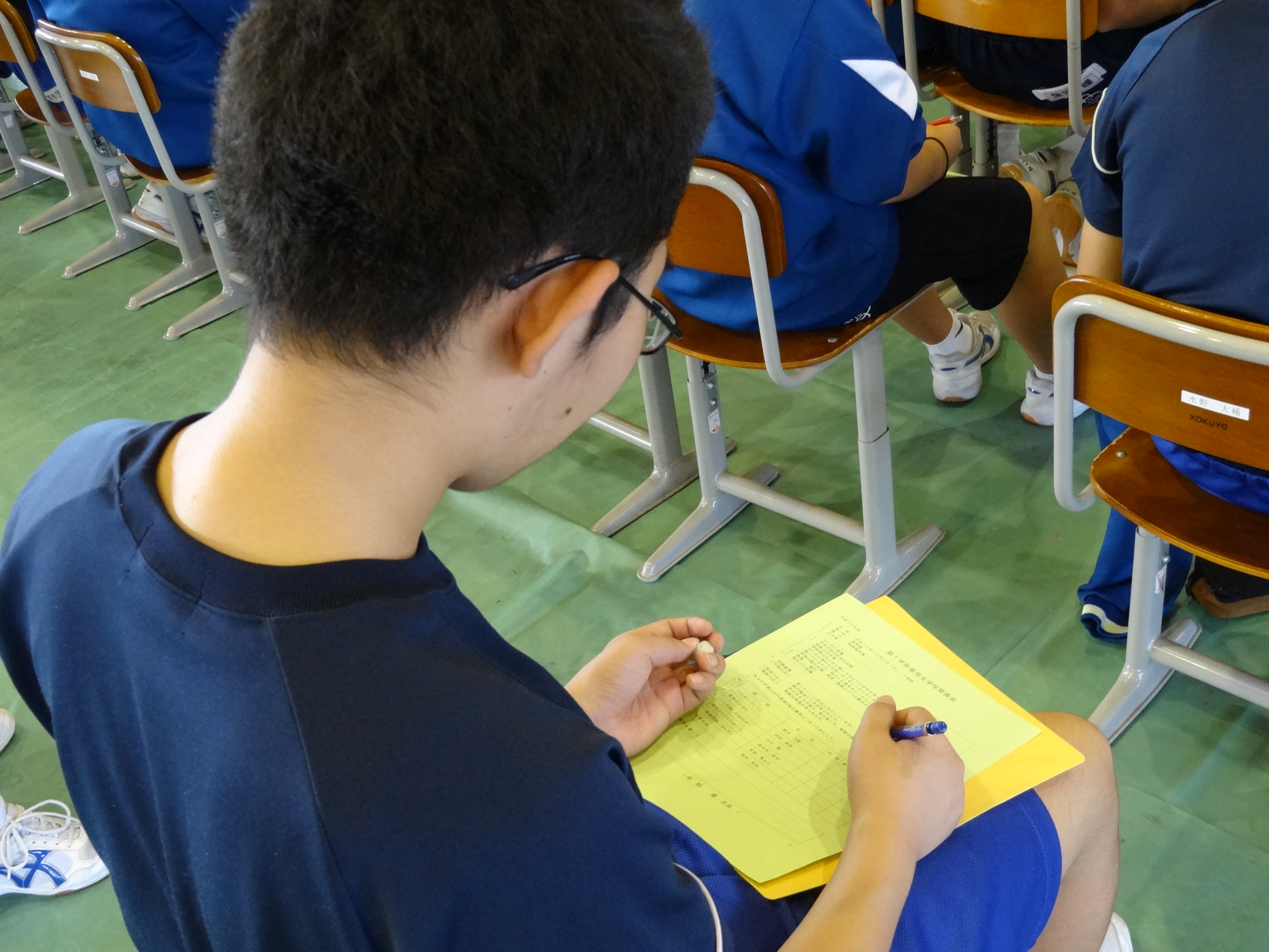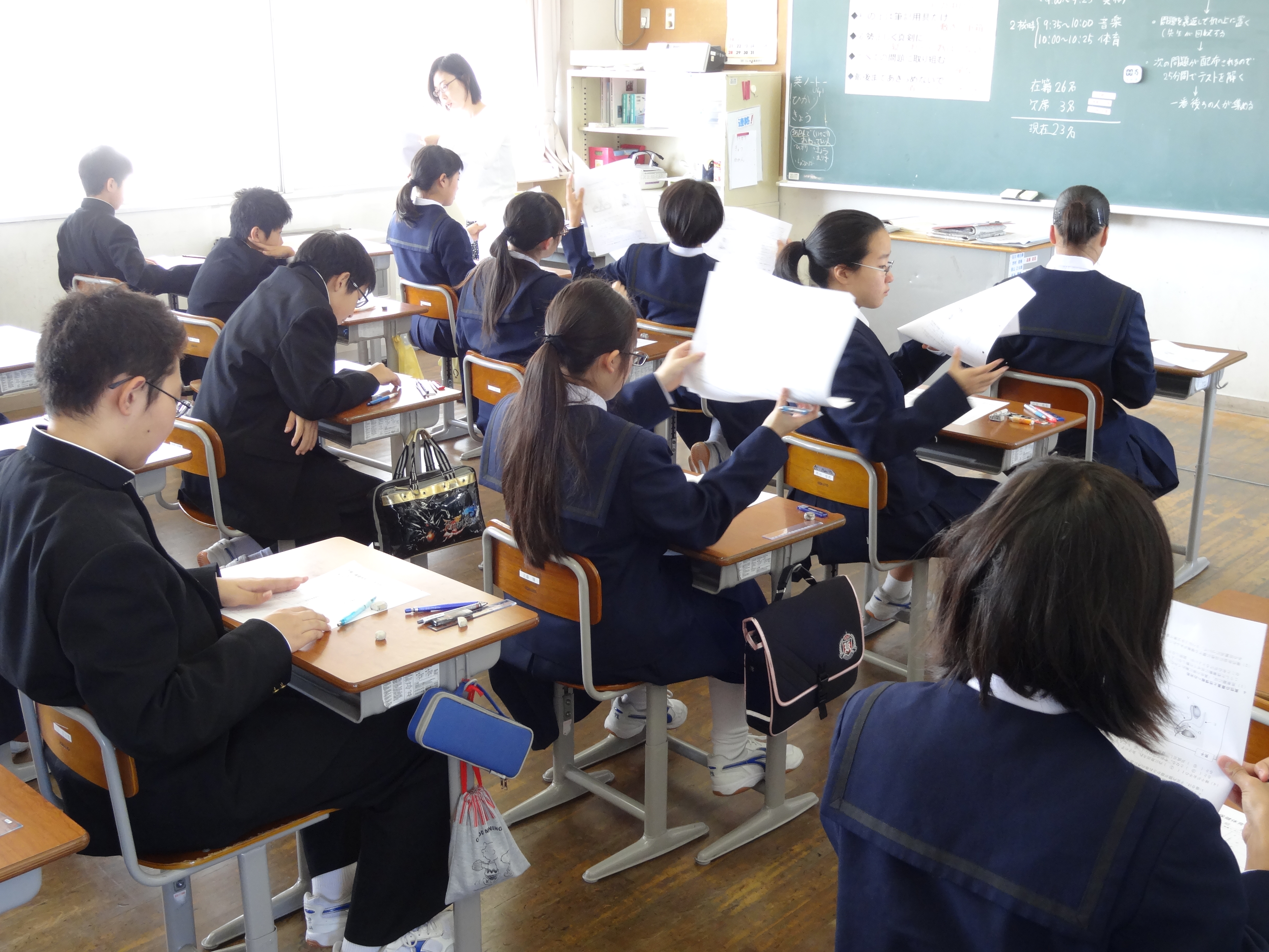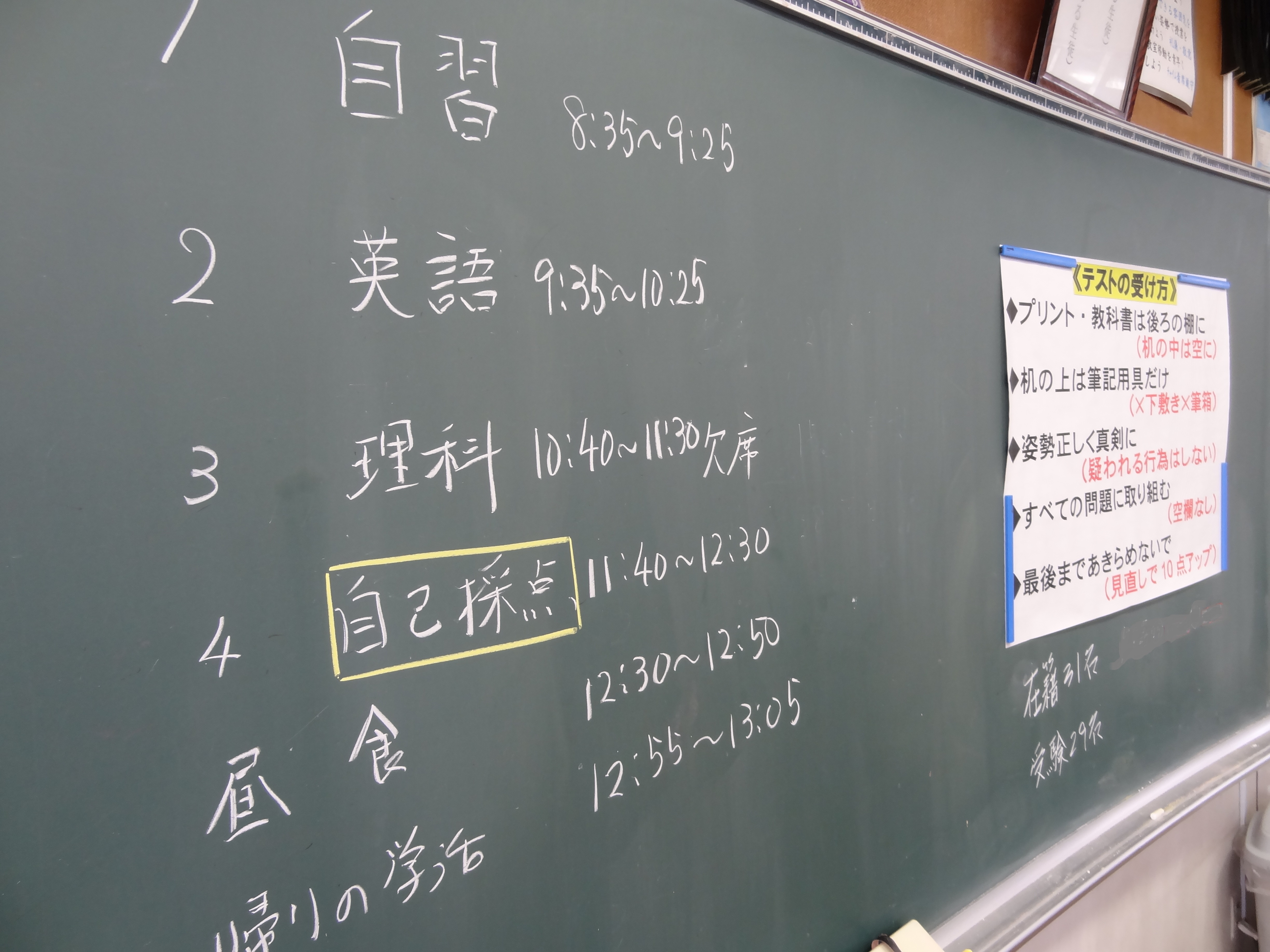 9月26日(水)・27日(木)、1・2年生が中体連岩瀬支部新人総合大会を行っている一方で、3年生は第3回実力テストを行いました。初日は3教科、2日目は残り2教科を行った後、自己採点をしました。前回のテストの自己採点では、1教科だけ1点違いで他の4教科は、自己採点と実際の得点がピッタリという生徒がいて、みんなが驚きました。そこで、今回の自己採点では全員が全教科ピッタリを目指し、テスト以上に真剣な眼差しで採点に臨んでいました。そして、自己採点の時間が終了すると、やはり後輩たちの試合結果が気になるようで、テスト監督の先生のもとに駆け寄り、試合結果を聞いている姿が印象的でした。