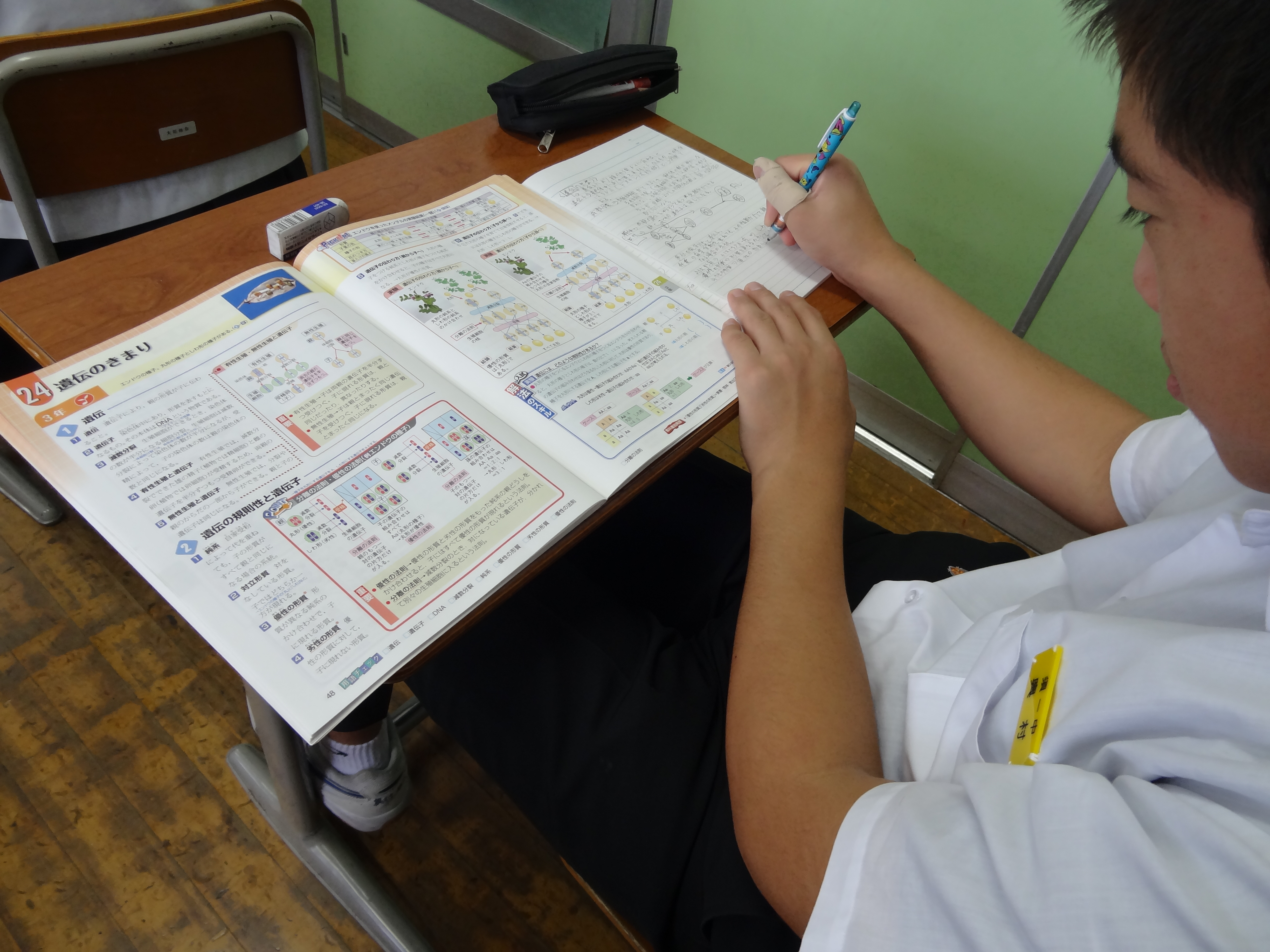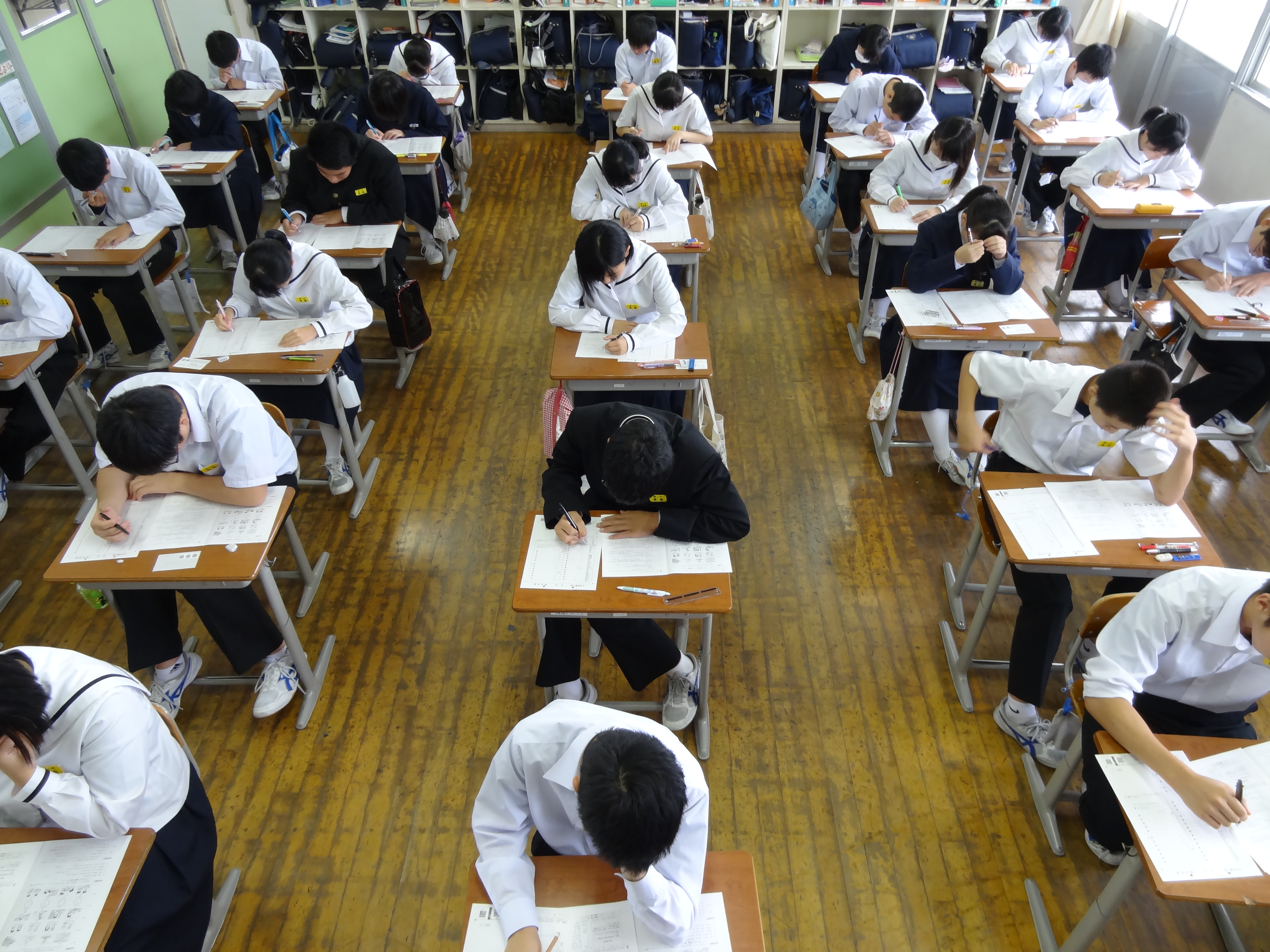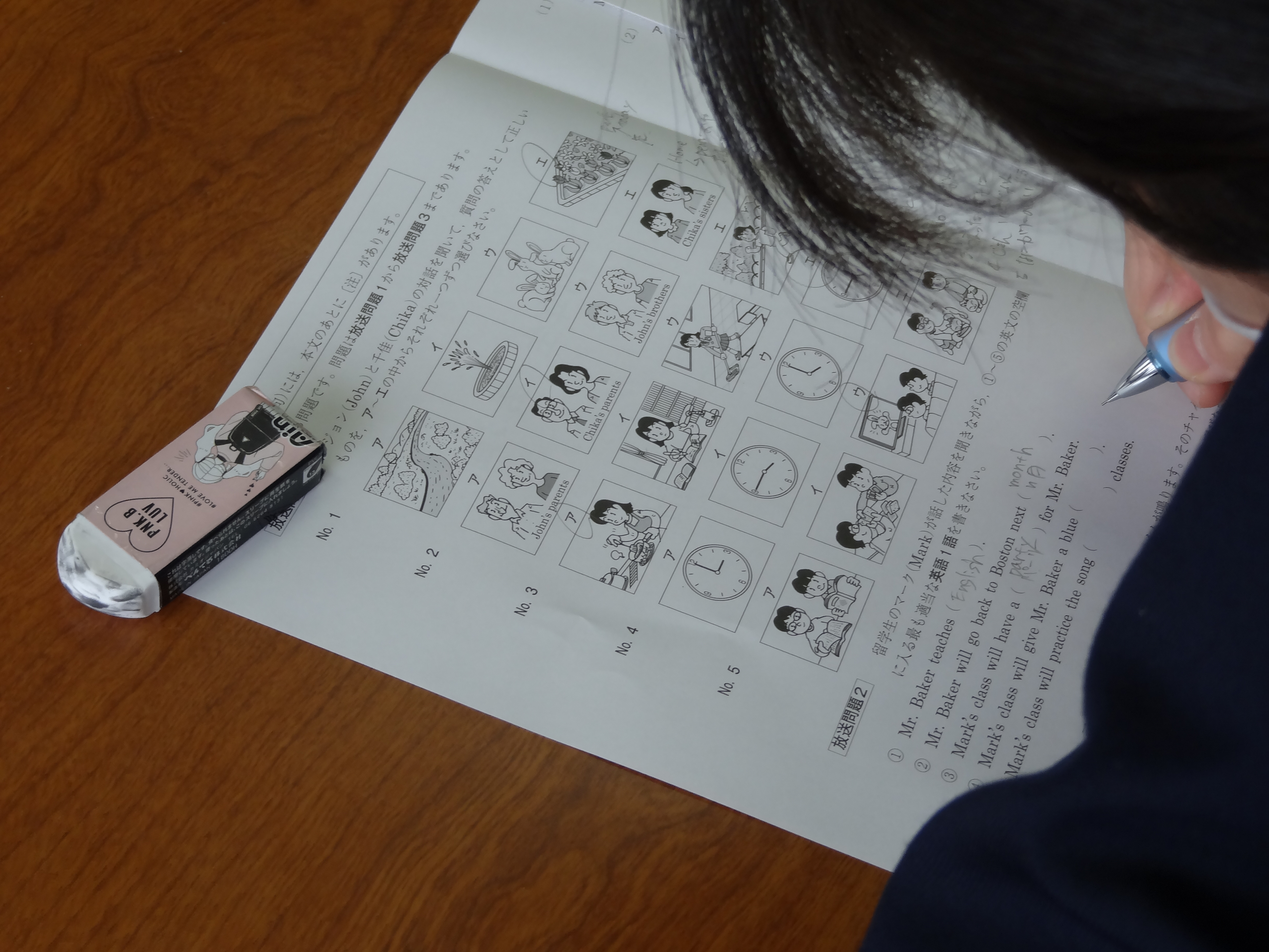 9月26日(水)・27日(木)、1・2年生が中体連岩瀬支部新人総合大会を行っている一方で、3年生は第3回実力テストを行いました。初日は3教科、2日目は残り2教科を行った後、自己採点をしました。前回のテストの自己採点では、1教科だけ1点違いで他の4教科は、自己採点と実際の得点がピッタリという生徒がいて、みんなが驚きました。そこで、今回の自己採点では全員が全教科ピッタリを目指し、テスト以上に真剣な眼差しで採点に臨んでいました。そして、自己採点の時間が終了すると、やはり後輩たちの試合結果が気になるようで、テスト監督の先生のもとに駆け寄り、試合結果を聞いている姿が印象的でした。