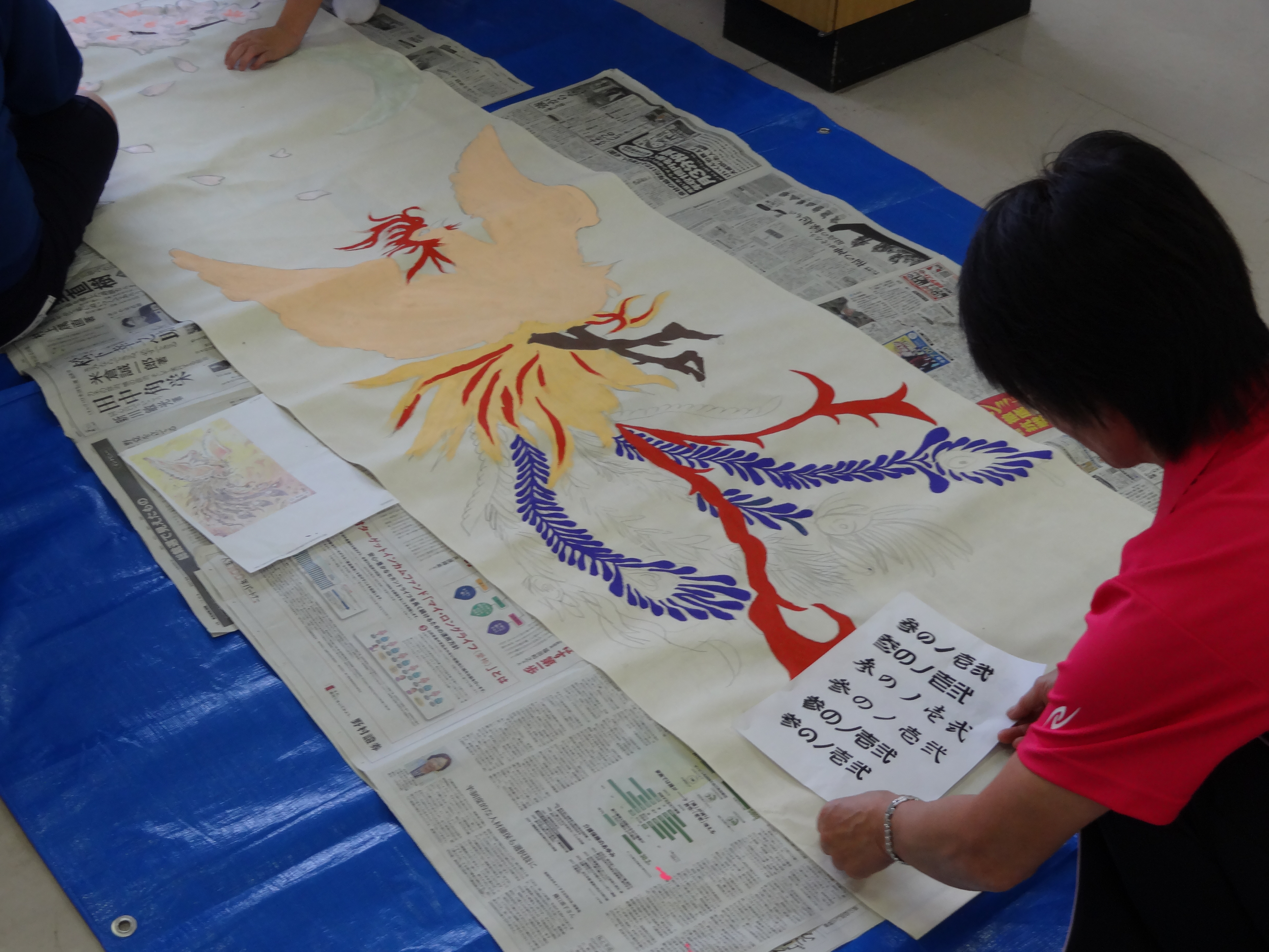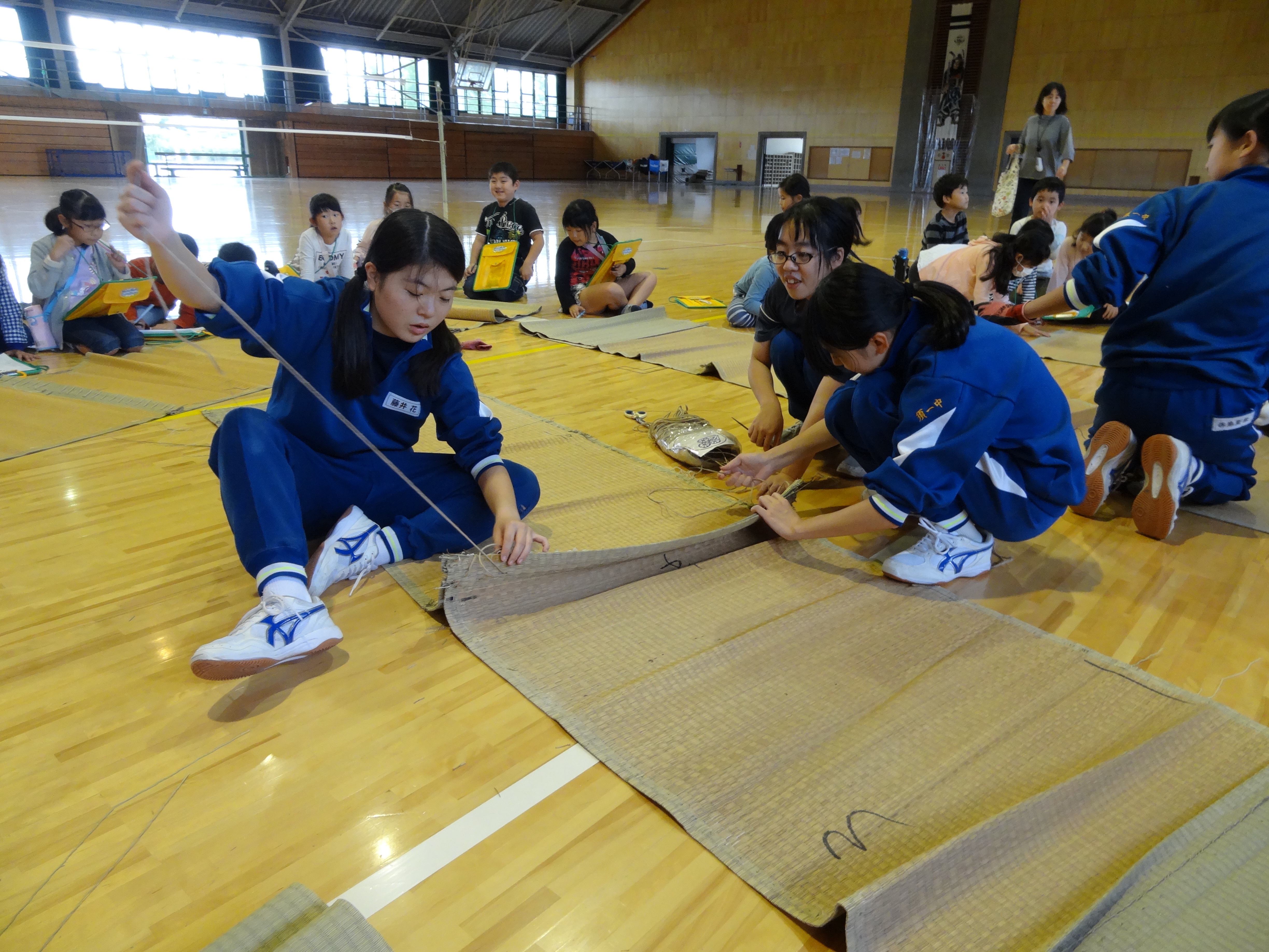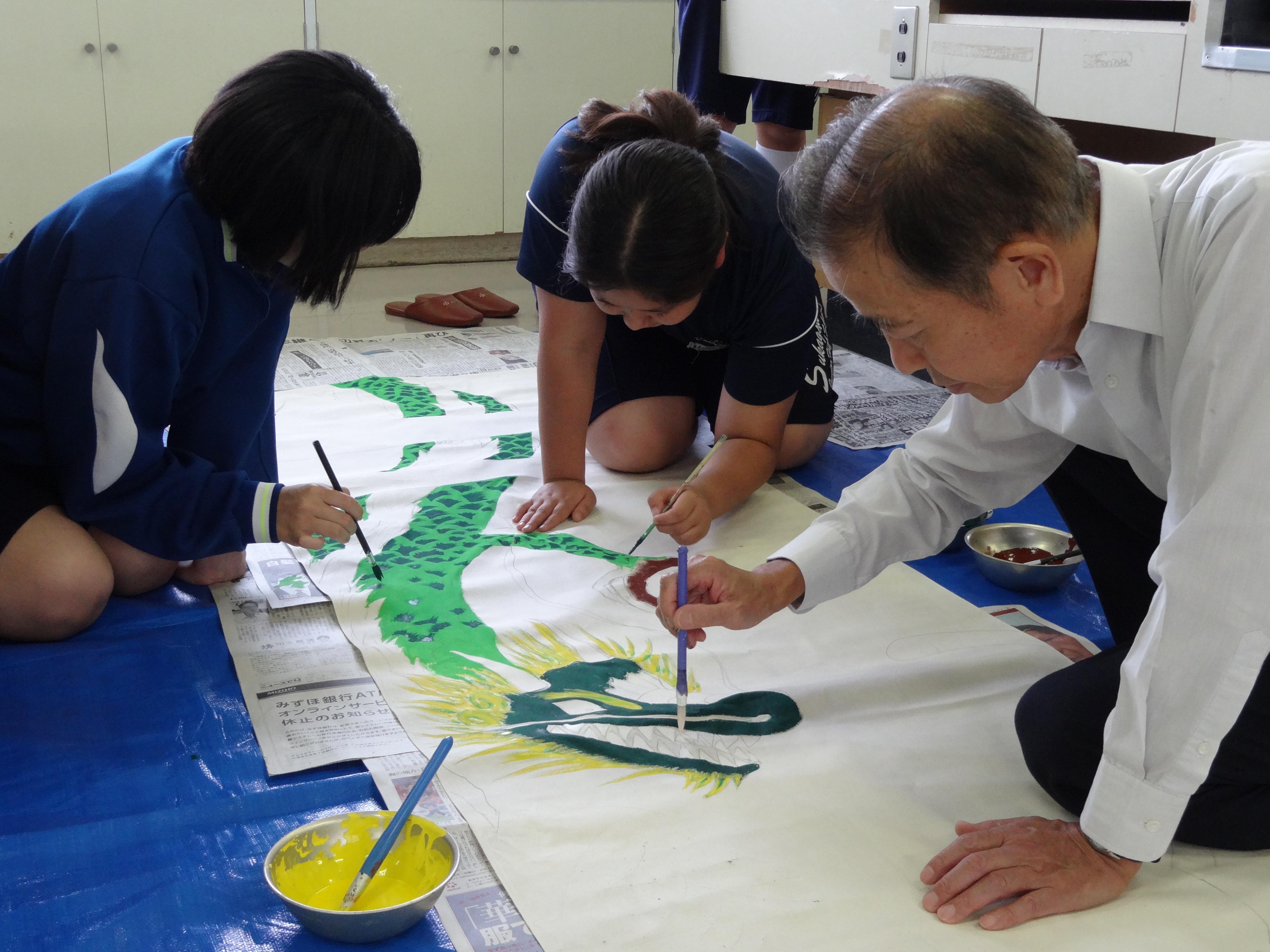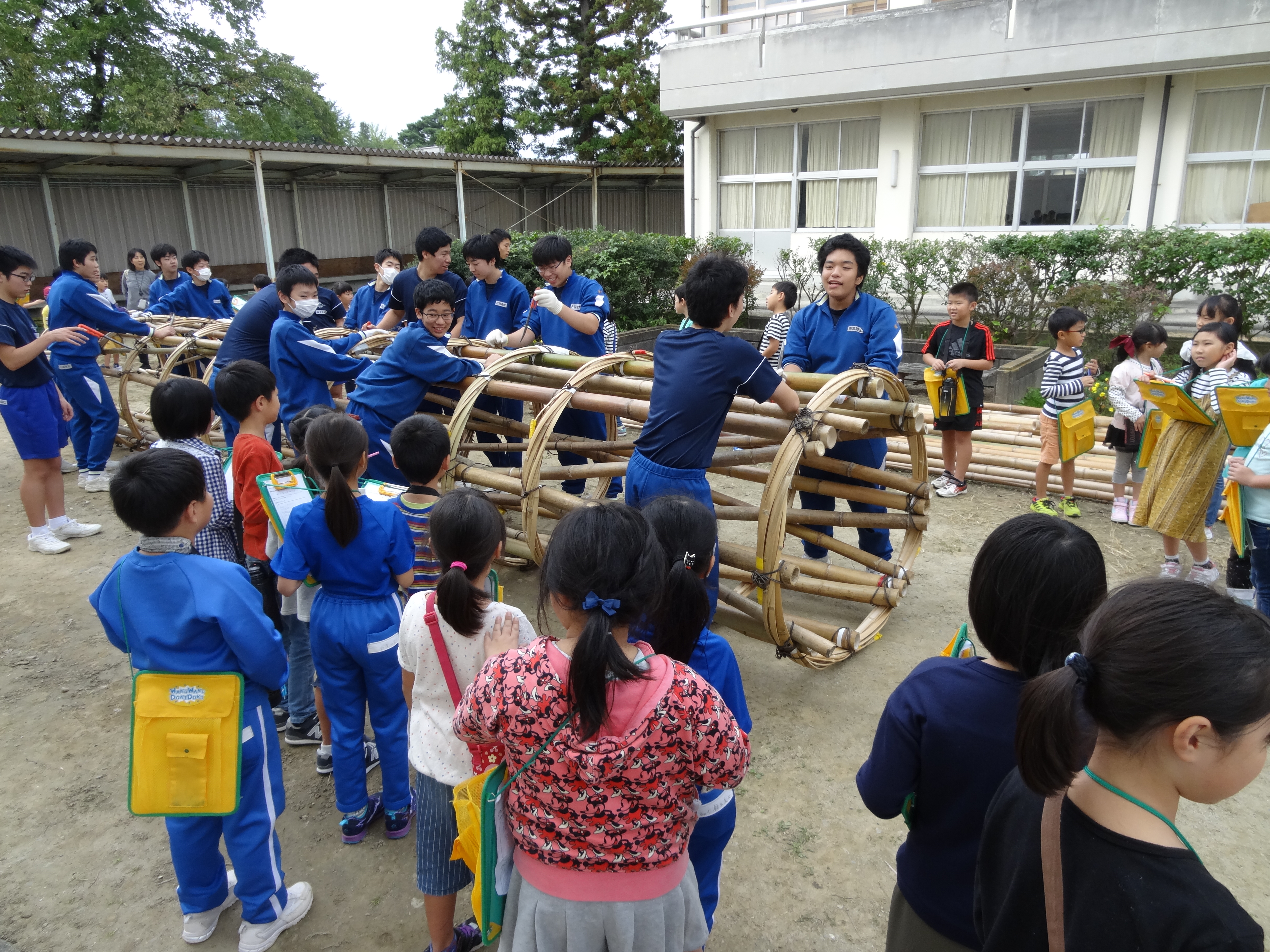 10月10日(水)6校時、3年生は、来週末の秀麗祭での学年発表に向けて、松明製作班・絵のぼり班・秀麗太鼓班に分かれて活動しました。今回は、須賀川一小の3年生が来校し、先輩たちの松明製作の様子を見学しました。生徒たちは、小学生の真剣な差しを背中に感じながら熱心に作業を進めました。松明製作では、これまで通り校長の指導を受けながら松明の骨組み製作をする一方、小貫尚様の御指導を受けながら松明を覆う畳表縫いを始めました。絵のぼり制作では、大野修司様の御指導を受けながらきれいな絵づけを進めることができました。秀麗太鼓班は、ふれあいセンターに移動して、法被を着て志気を高めて太鼓の練習に取り組みました。