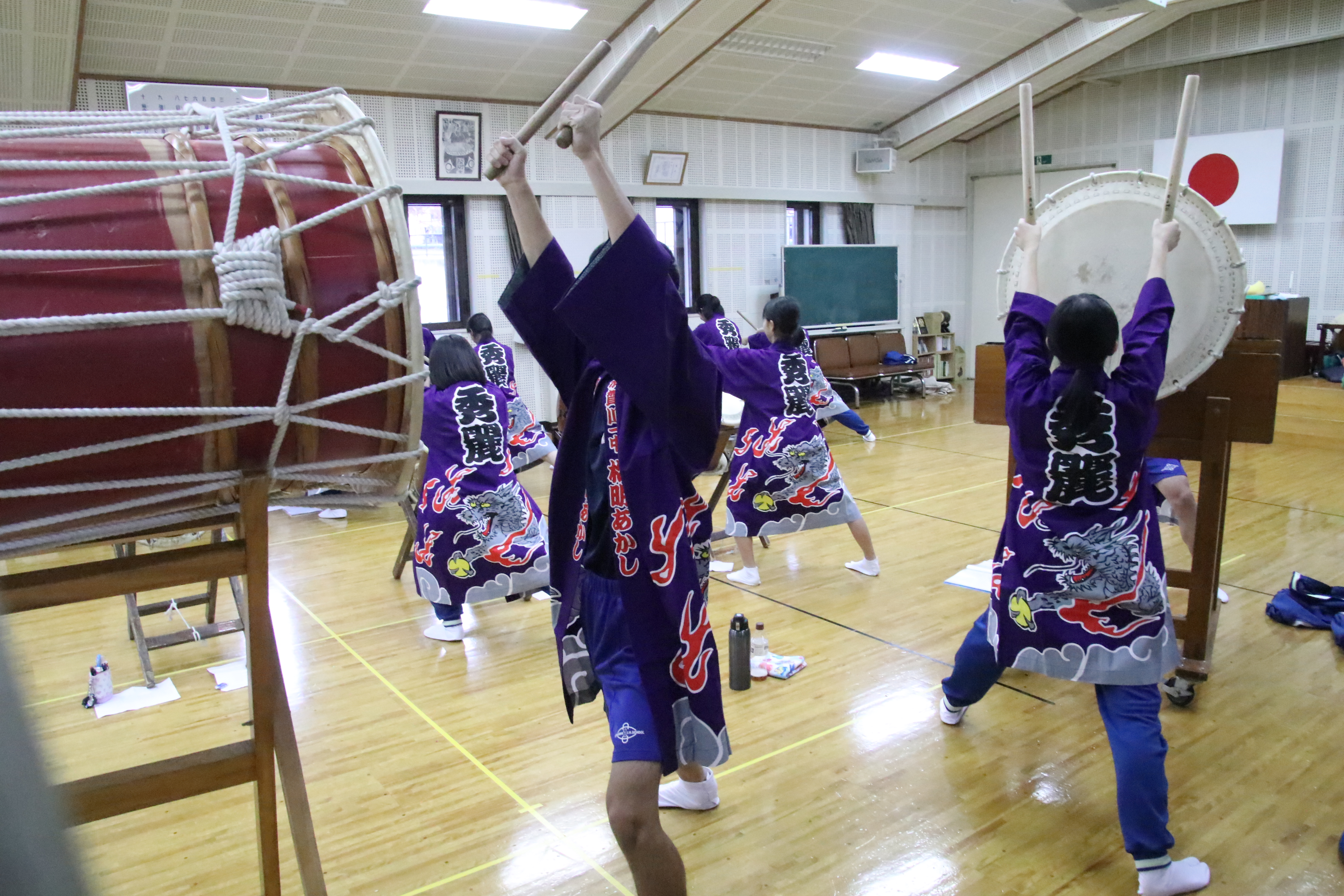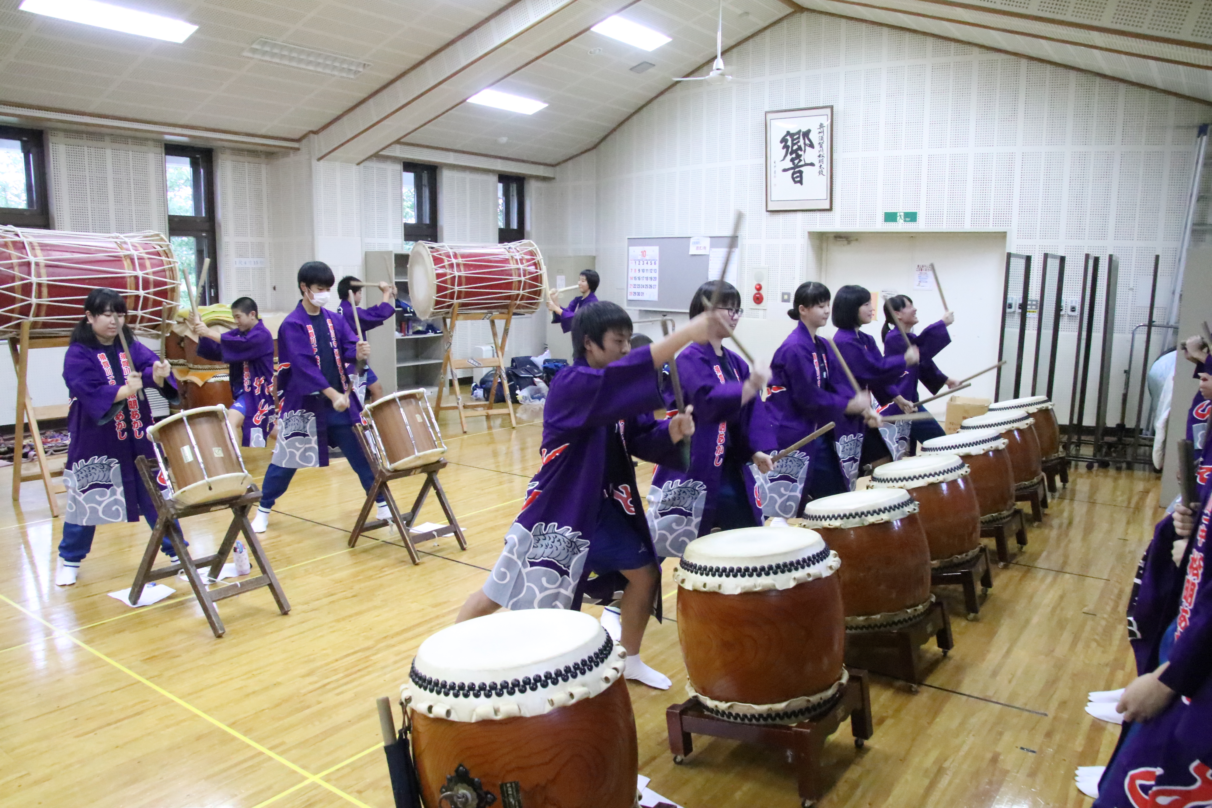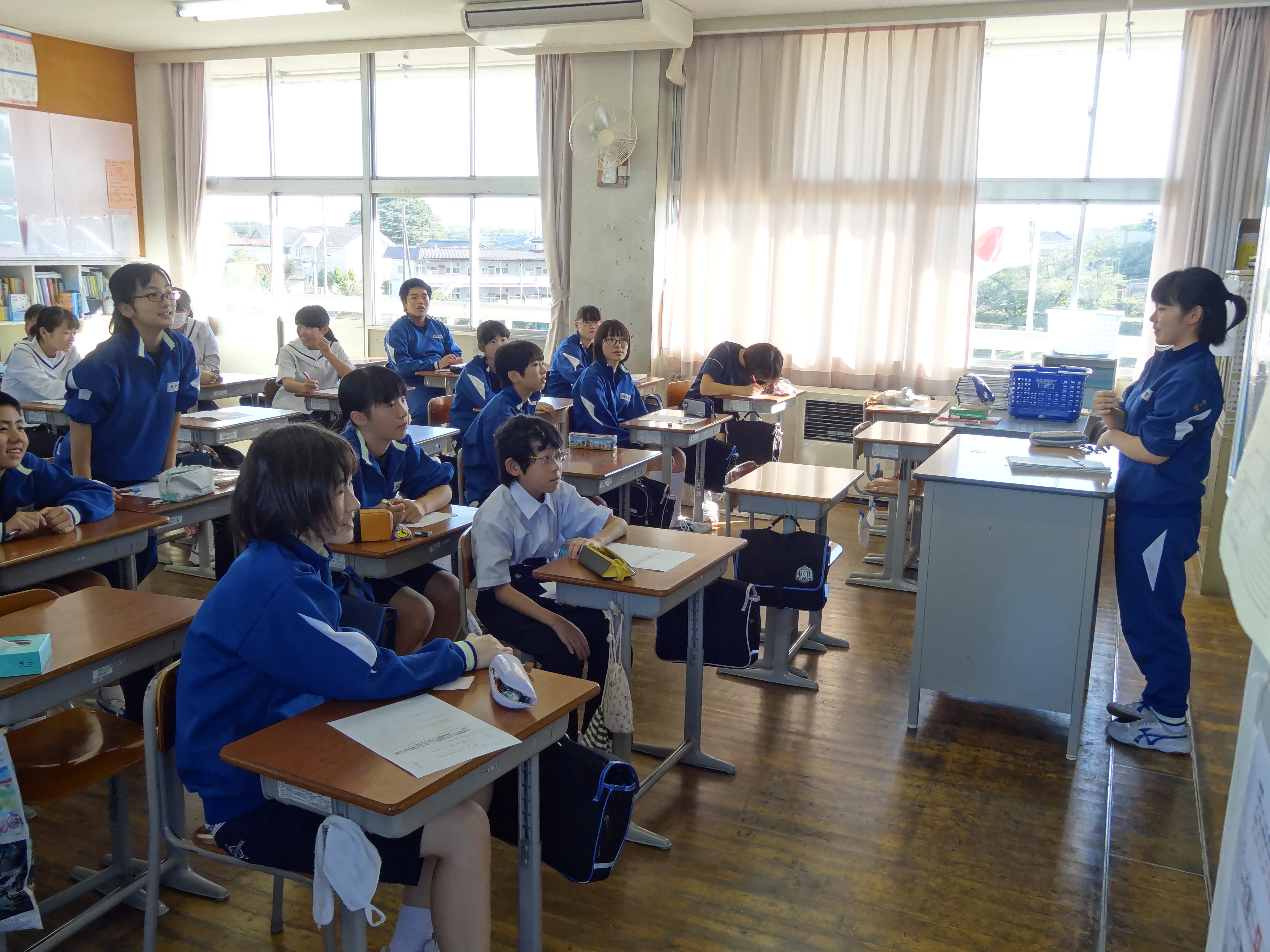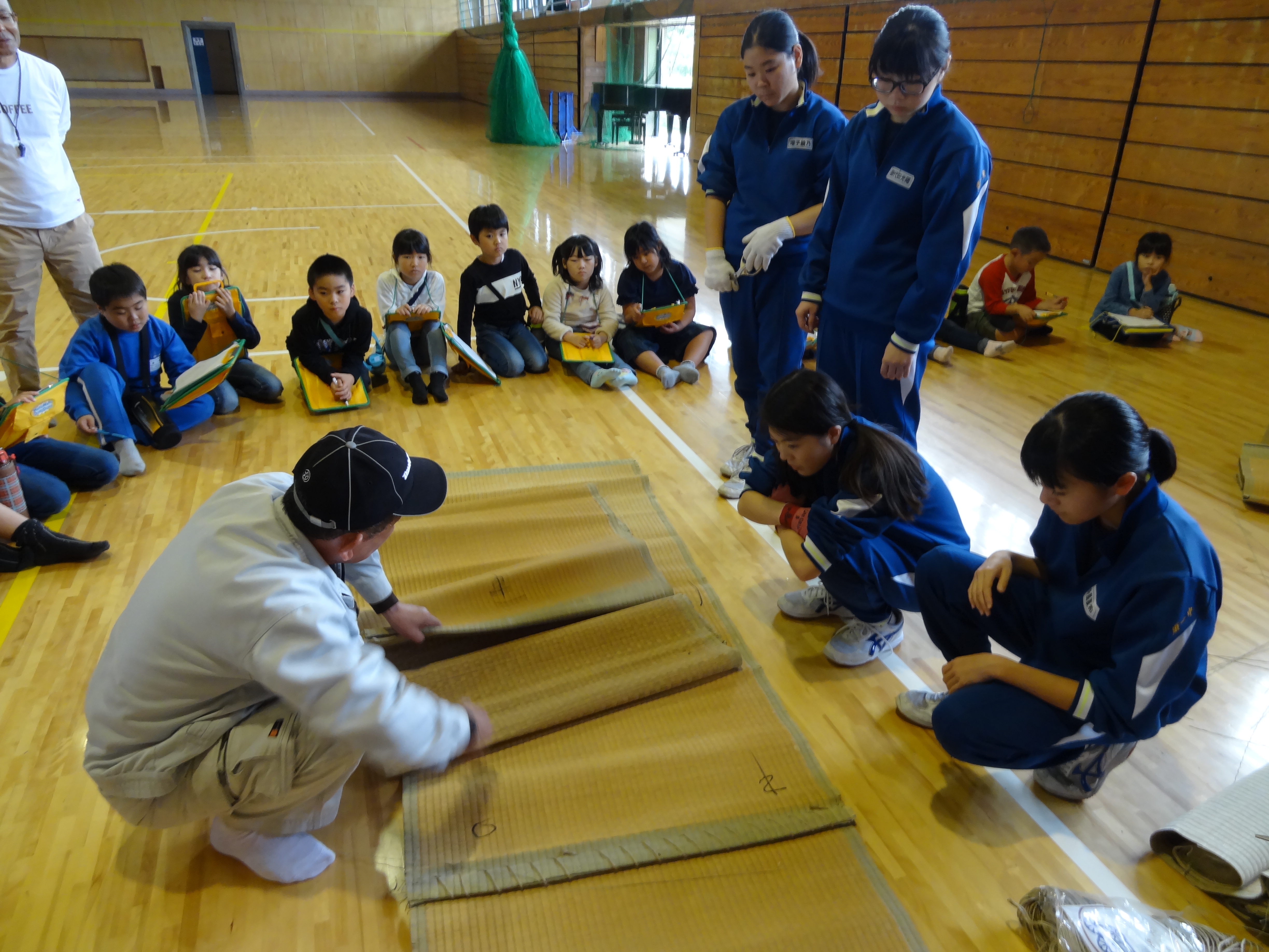 10月10日(水)6校時、3年生は、来週末の秀麗祭での学年発表に向けて、松明製作班・絵のぼり班・秀麗太鼓班に分かれて活動しました。今回は、須賀川一小の3年生が来校し、先輩たちの松明製作の様子を見学しました。生徒たちは、小学生の真剣な差しを背中に感じながら熱心に作業を進めました。松明製作では、これまで通り校長の指導を受けながら松明の骨組み製作をする一方、小貫尚様の御指導を受けながら松明を覆う畳表縫いを始めました。絵のぼり制作では、大野修司様の御指導を受けながらきれいな絵づけを進めることができました。秀麗太鼓班は、ふれあいセンターに移動して、法被を着て志気を高めて太鼓の練習に取り組みました。