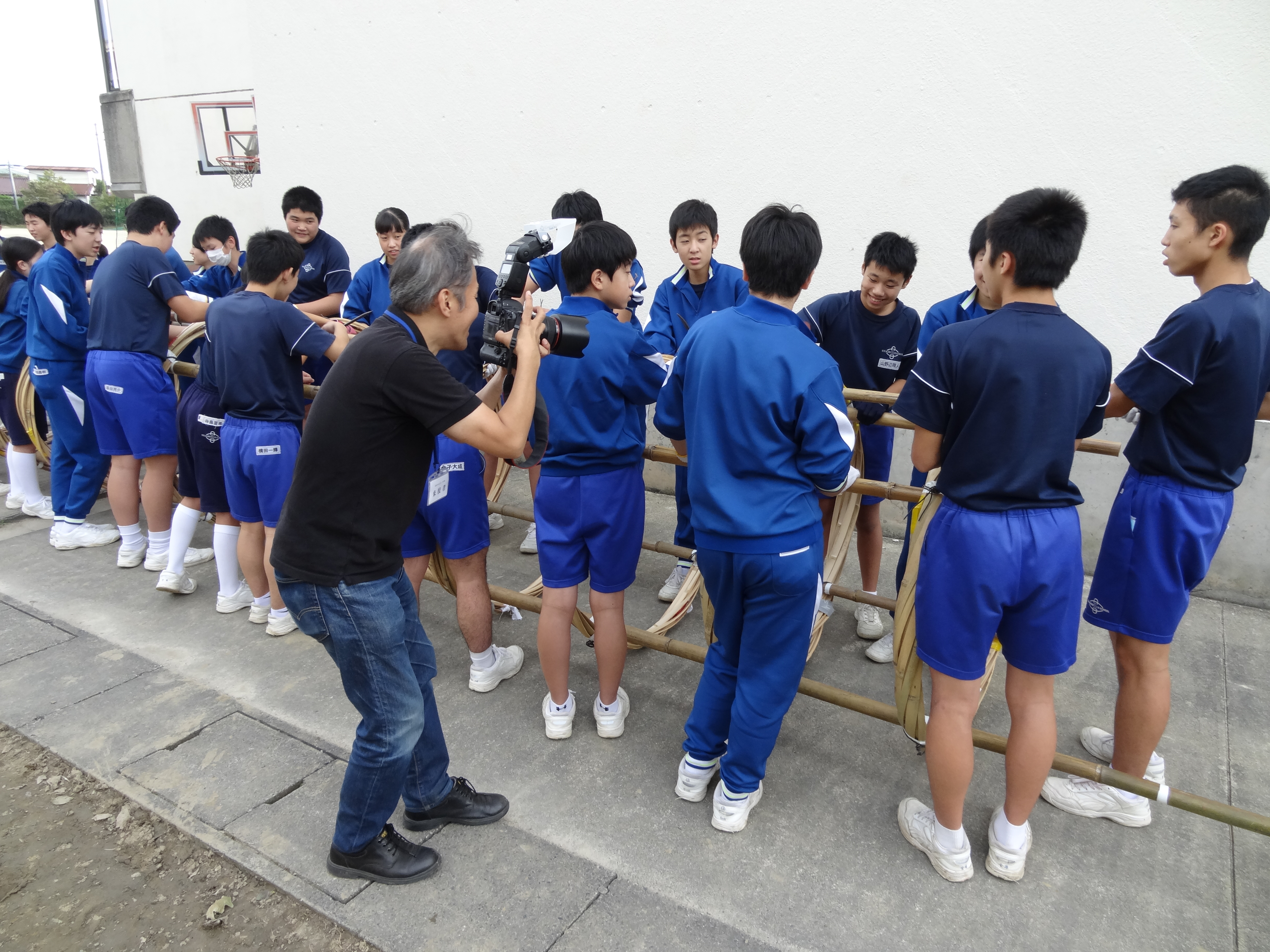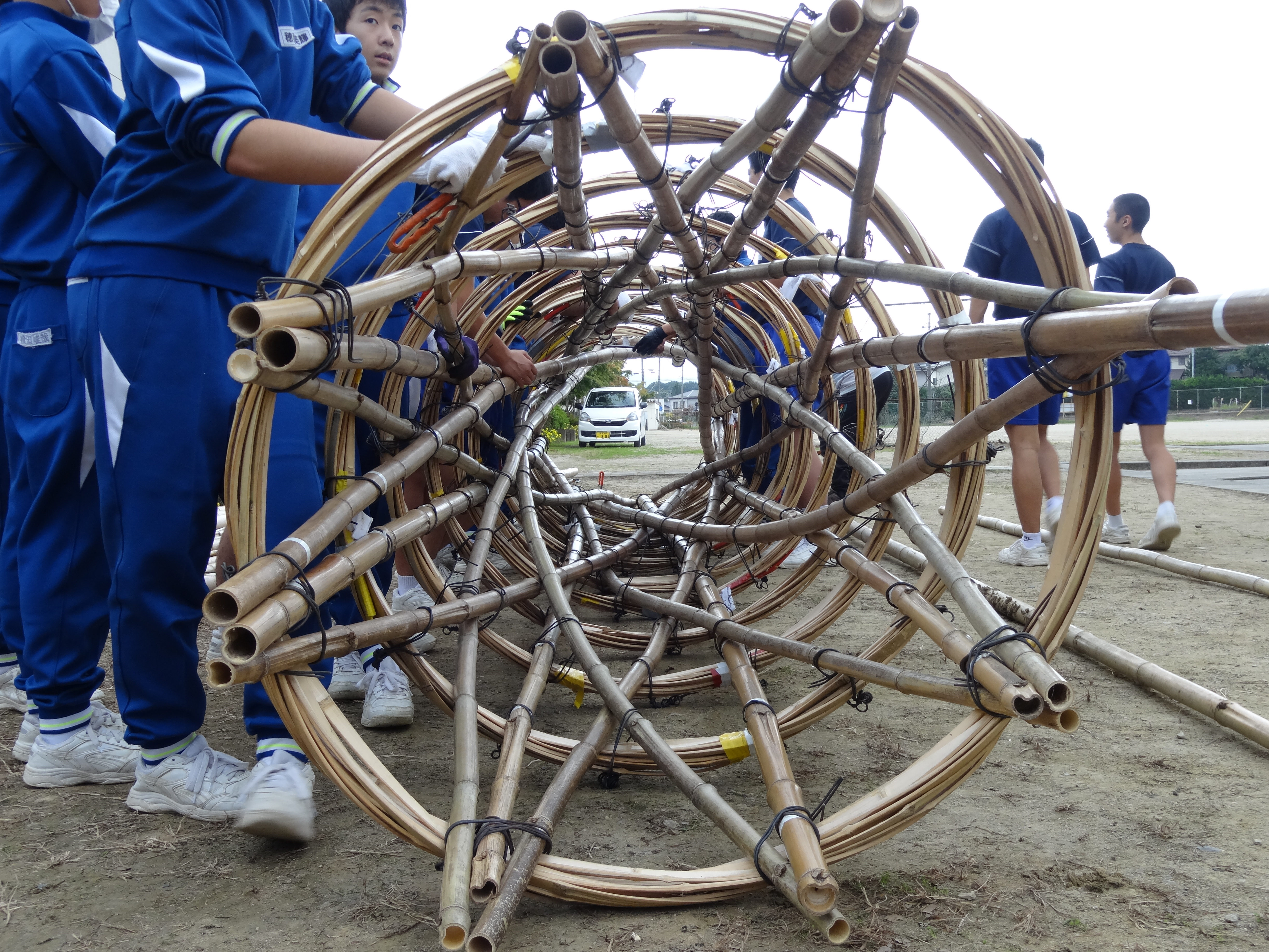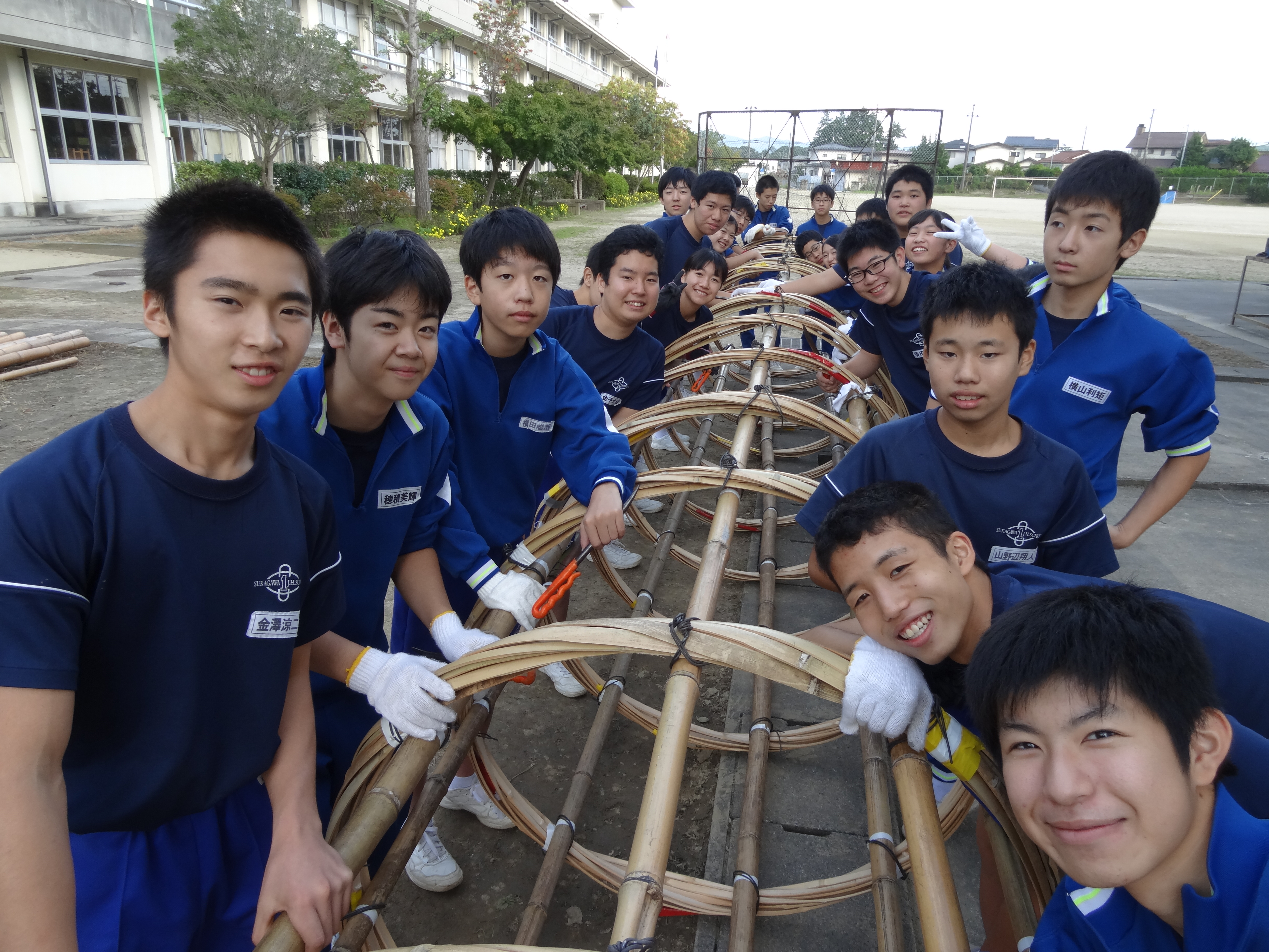 10月3日(水)6校時、3年生は秀麗祭での学年発表に向けて班ごとに活動しました。秀麗太鼓班は、ふれあいセンターに行き、太鼓の練習をしました。21名の息が少しずつ合ってきており、力強い音色が聞こえるようになりました。絵のぼり班は、大野修司様の御指導のおかげで迫力ある下絵が描き上がり、絵づけが始まりました。松明製作班は、丸いたがへの竹の固定作業が前回よりも上手になり、8本の主竹の固定作業がスムーズに終了し、斜めに入れる力竹の固定作業に入りました。なお、市内の「月刊すかっと」編集室が絵のぼり係と松明製作係の活動の様子を取材してくださいました。生徒たちは恥ずかしがるどころか、いつもよりテンションを上げて作業に取り組んでいました。作品の完成も待ち遠しいですが、「月刊すかっと」にどんな記事が載るか、今からとても楽しみです。