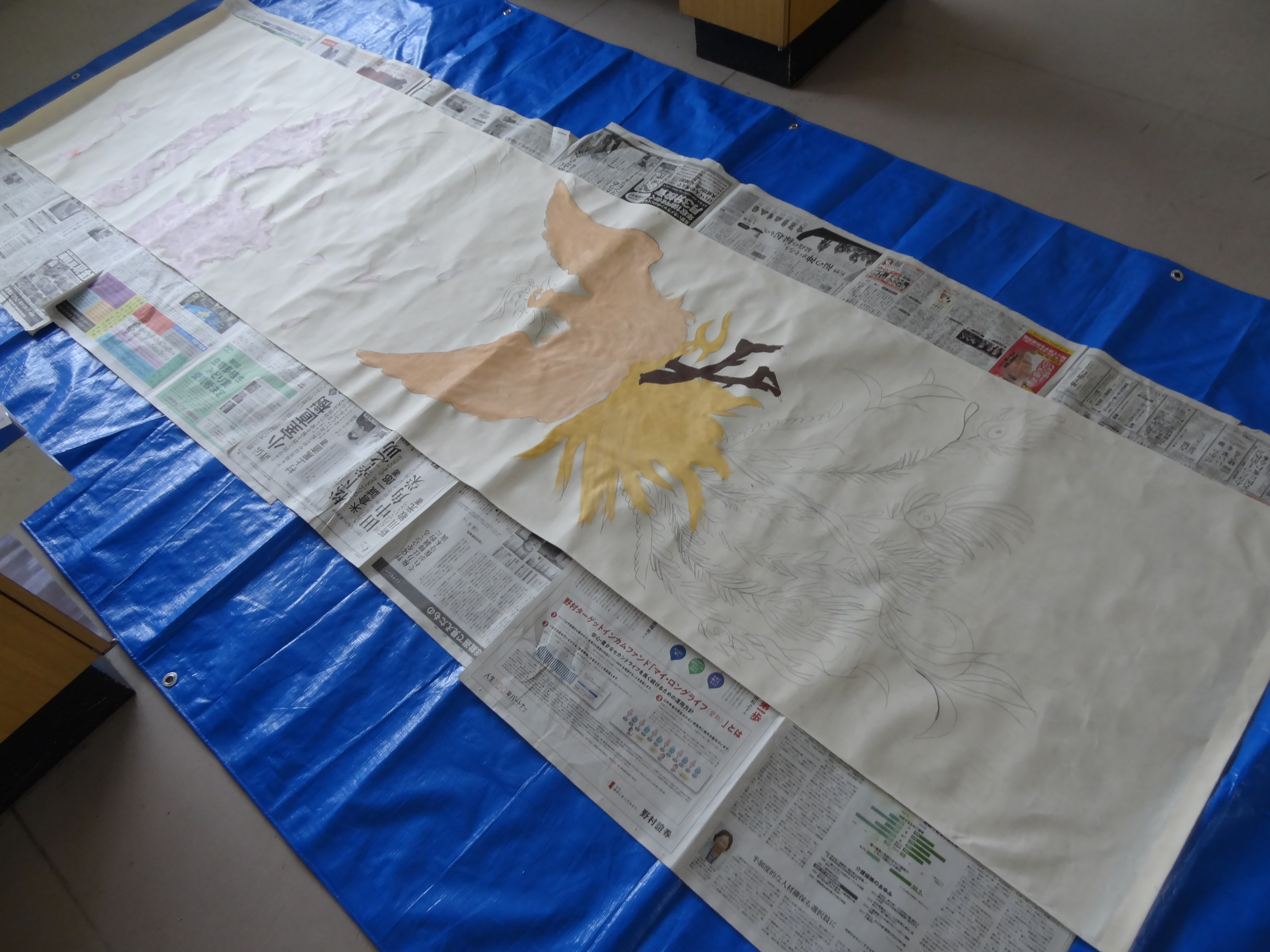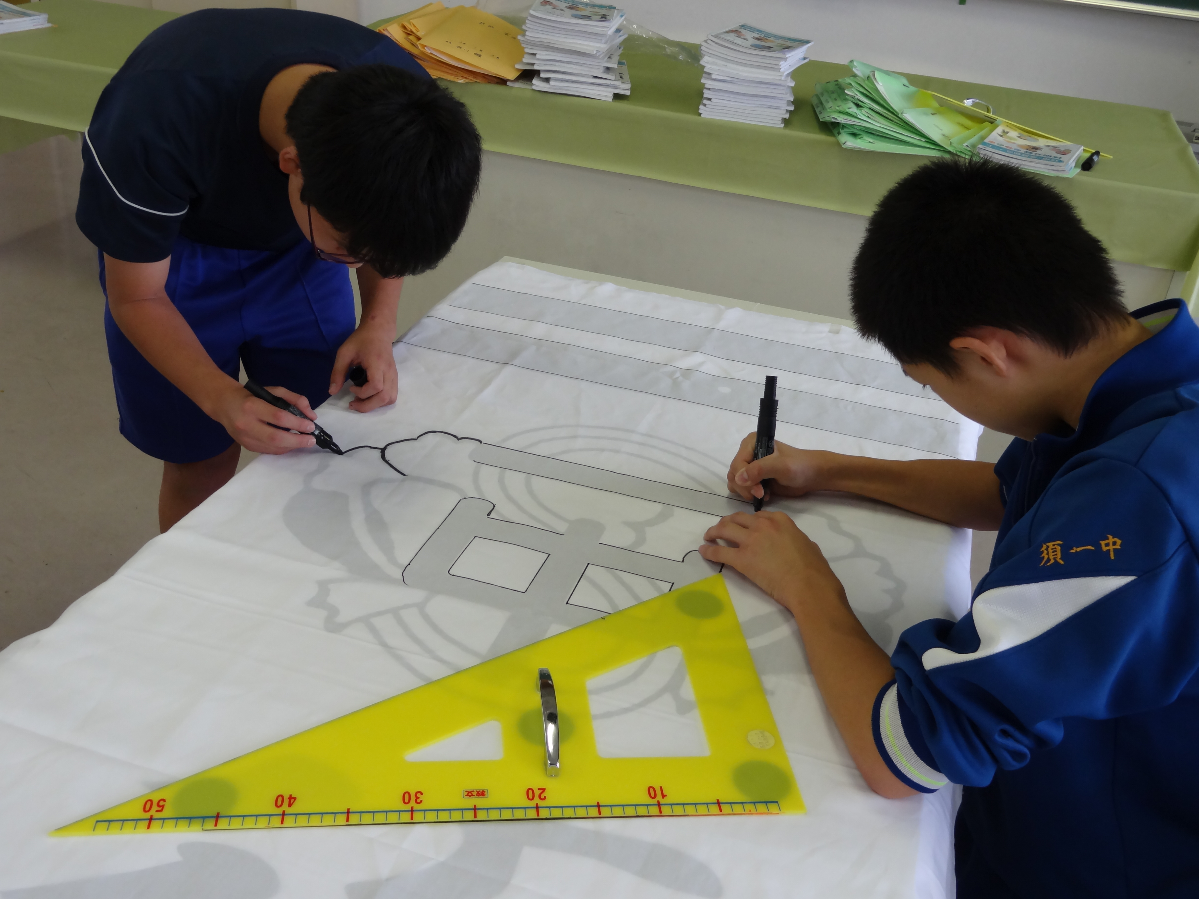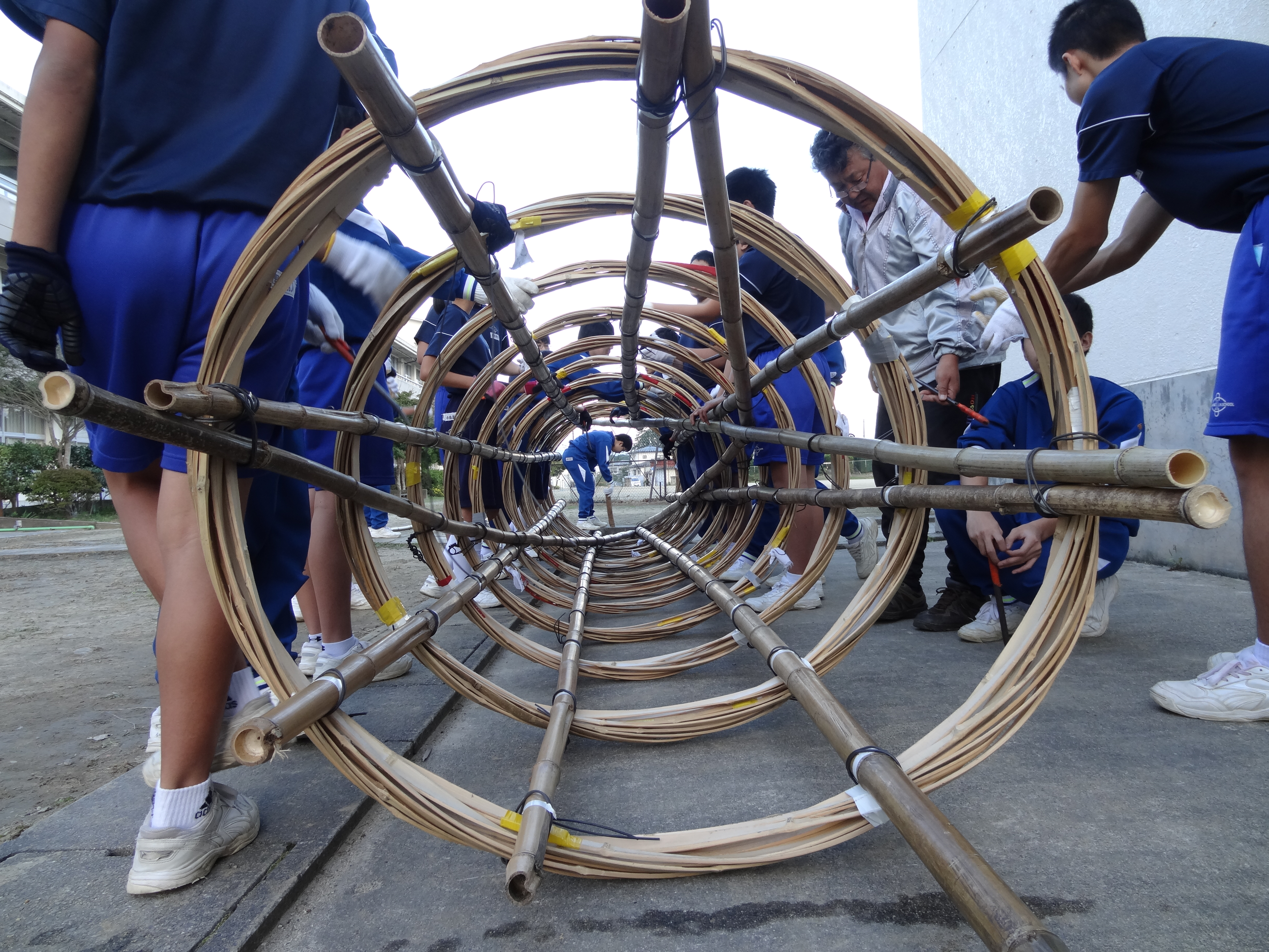 10月3日(水)6校時、3年生は秀麗祭での学年発表に向けて班ごとに活動しました。秀麗太鼓班は、ふれあいセンターに行き、太鼓の練習をしました。21名の息が少しずつ合ってきており、力強い音色が聞こえるようになりました。絵のぼり班は、大野修司様の御指導のおかげで迫力ある下絵が描き上がり、絵づけが始まりました。松明製作班は、丸いたがへの竹の固定作業が前回よりも上手になり、8本の主竹の固定作業がスムーズに終了し、斜めに入れる力竹の固定作業に入りました。なお、市内の「月刊すかっと」編集室が絵のぼり係と松明製作係の活動の様子を取材してくださいました。生徒たちは恥ずかしがるどころか、いつもよりテンションを上げて作業に取り組んでいました。作品の完成も待ち遠しいですが、「月刊すかっと」にどんな記事が載るか、今からとても楽しみです。