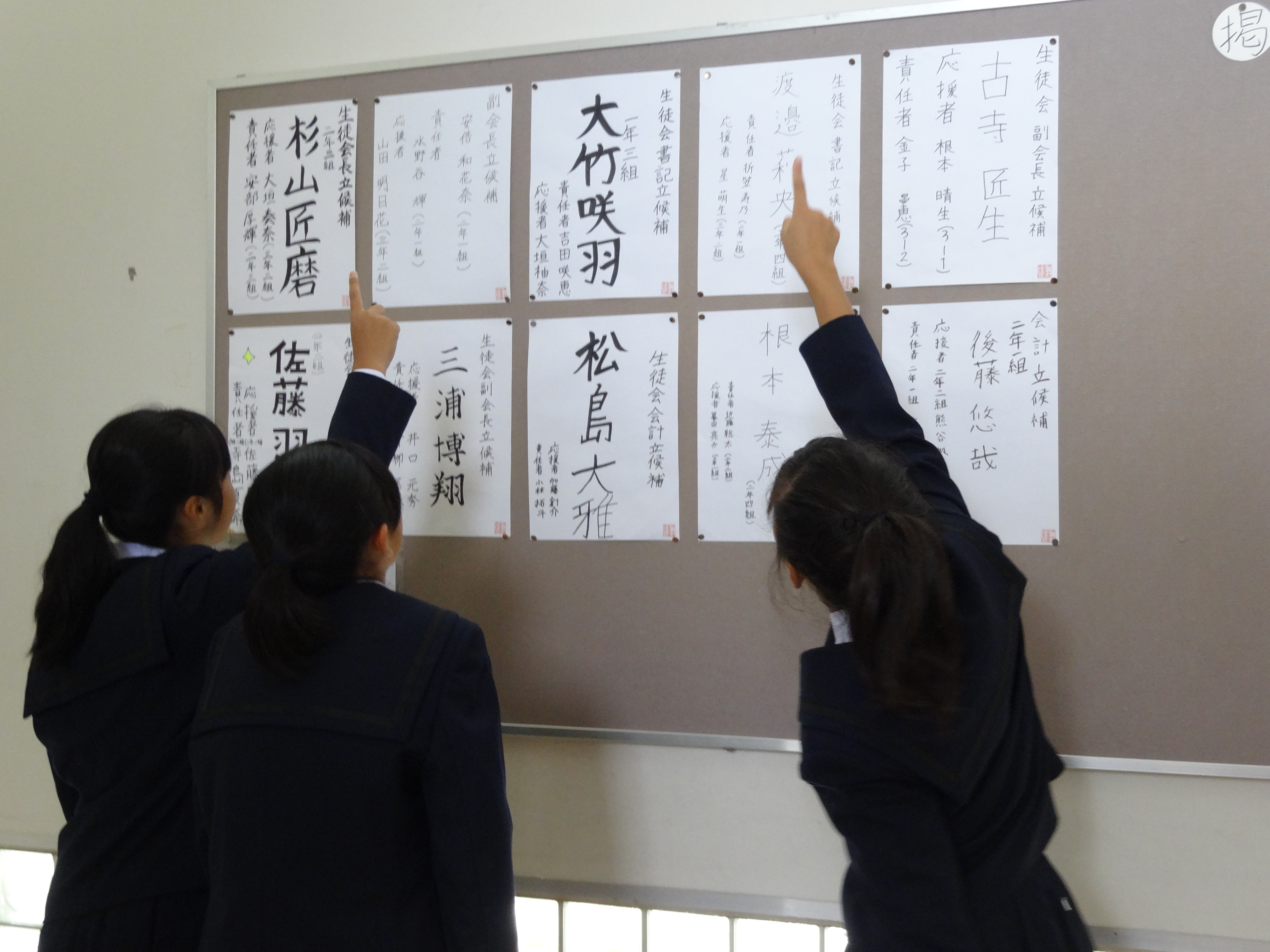 全校生の生徒会役員選挙への関心度も日に日に高まってきています。立候補者のみなさん、投票日まで選挙運動を頑張りましょう!