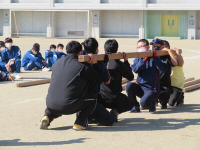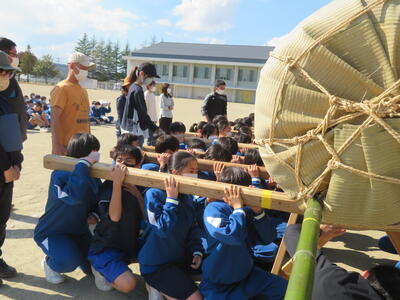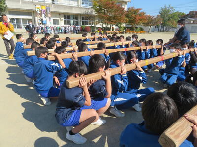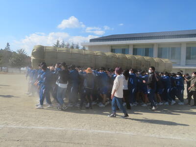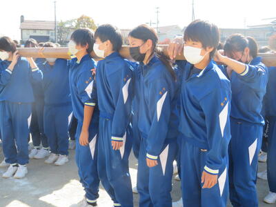 本日、松明運搬に向けて、肩合わせと運搬の練習を行いました。全校生が力を合わせて松明を持ち上げ、担いで運搬することができました。