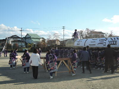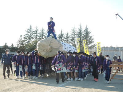 先週、松明運搬に向けて、肩合わせと運搬の練習を行いました。生徒全員が初めての経験でしたが、全校生が力を合わせて松明を持ち上げ、担いで運搬することができました。