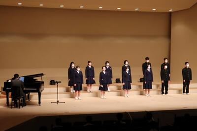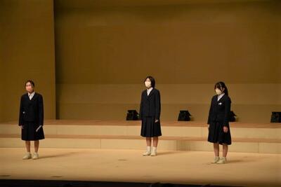 合唱の最後には、特設合唱部と常設合唱部の発表です。常設合唱部は今年度で廃部となり3年生3名の部員でした。そのため今年度から特設合唱部が組織されてコンクール等に参加してきました。3名の常設合唱部員の発表はとても美しいハーモニーをホールいっぱいに響かせて、聴いている人はとても感動しました。