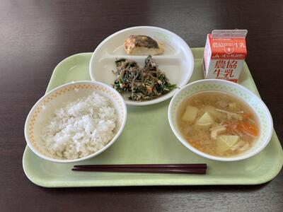麦ごはん、牛乳、真鯛のみそマヨネーズ焼き、こんにゃくごまサラダ、えのきのみそ汁です。
