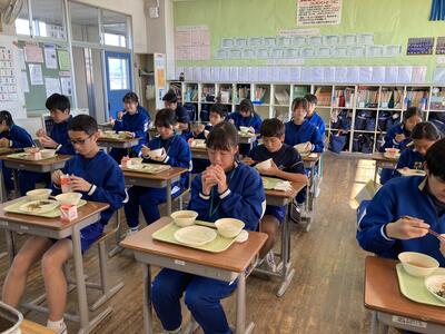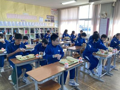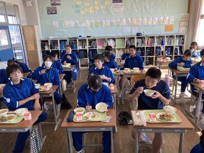 今日は2年生の給食の様子をのぞいてみました。みんな黙食を守っていましたが、その表情は美味しい給食を食べてみんな笑顔でした。