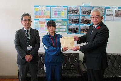 本日、須賀川市社会福祉協議会の方にお越しいただき、生徒会専門部のJRC部が集めた赤い羽根共同募金をお渡ししました。