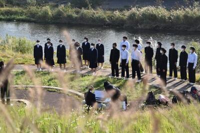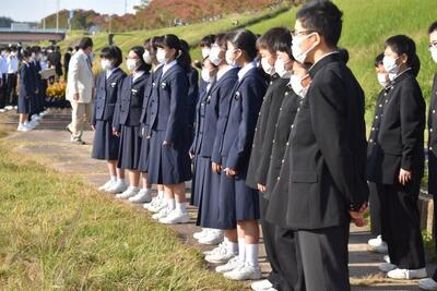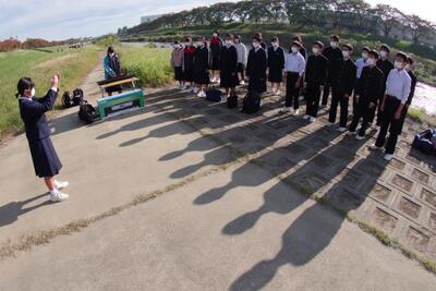 各学級少し早めに集まって、文化センター前の釈迦堂川の河川敷で合唱の練習を行っていました。