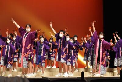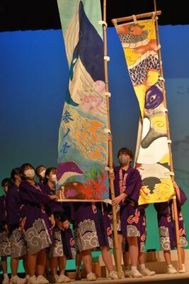 3年生は、松明あかしで使う絵のぼり制作の様子と、よさこいを全員で披露するとともに、よさこいリーダー班のメンバーによる南中ソーランを披露しました。迫力あるよさこいに感動しました。
