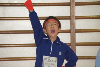 紅白応援団長のリードのもと、雨雲を吹き飛ばすような力強い声が、体育館に響き渡りました。
