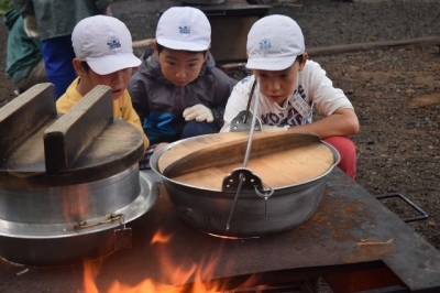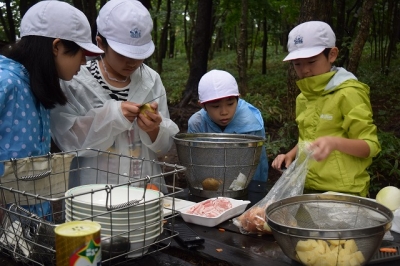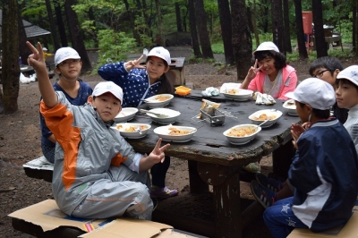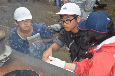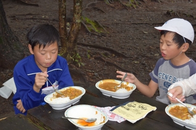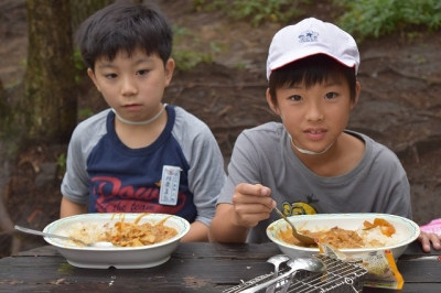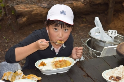 火おこしも初めてといった子どもたちも多く、コツを教わりながら一生懸命火をつけて慣れない手つきで野菜を切り、何とかカレーを完成させました。