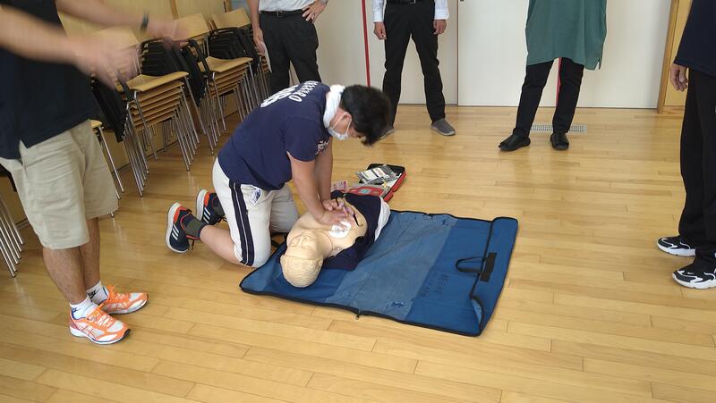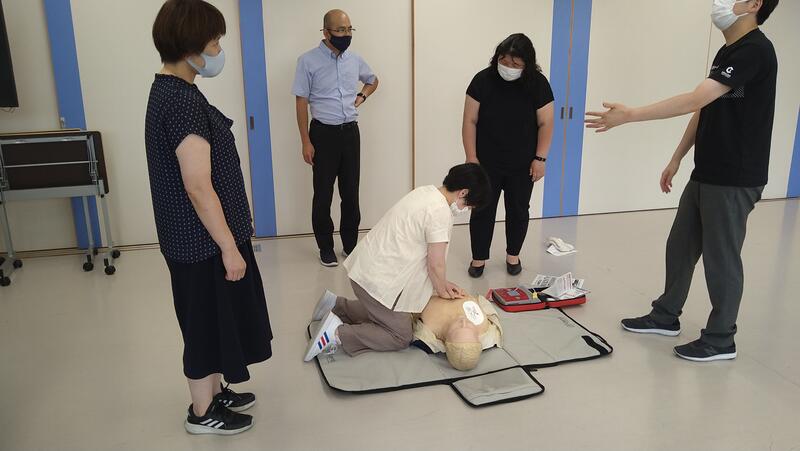 2021年7月20日 16時00分明日からの夏季休業を前にして、万が一の際の救急車の要請、心肺蘇生やAEDの取扱いなどについて、全職員で確認しました。