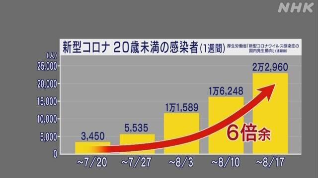 厚生労働省が公表している「新型コロナウイルス感染症の国内発生動向」の速報値によりますと、8月17日までの1週間に全国で感染が確認された人のうち20歳未満の数は2万2960人に上っています。
