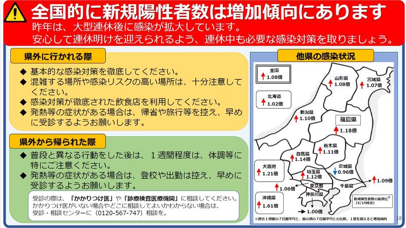 全国的に感染者数の増加が見られる中、これから大型連休、ゴールデンウィークを迎えます。安心して連休を過ごすことができるよう、連休前から必要な感染対策を御検討ください。