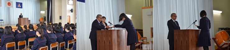 その後、卒業記念品を代表の斎藤未菜さんが授与し、佐藤怜奈さんが誓いの言葉を述べました。
