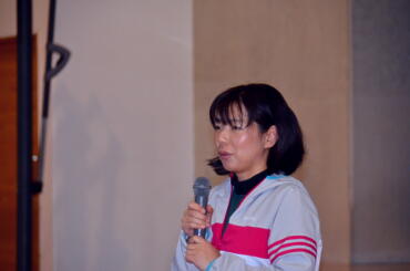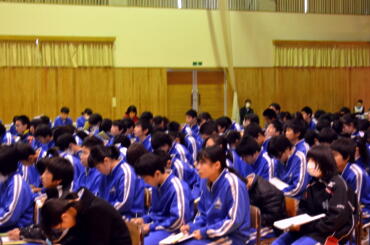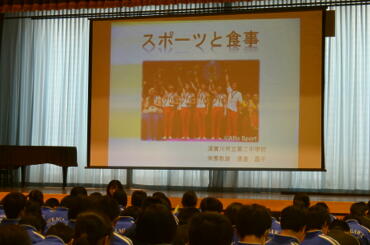 渡邊先生は「スポーツと食事」という題でお話しいただき、大会前に必要な食事など具体的な内容をお話しいただきました。生徒も真剣に話しを聞いていました。