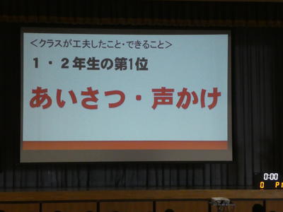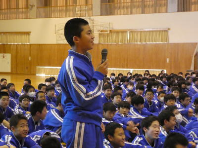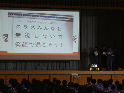 最後に生徒会長から、本年度の反省と来年度の「いじめゼロ宣言」を全校に提示しました。