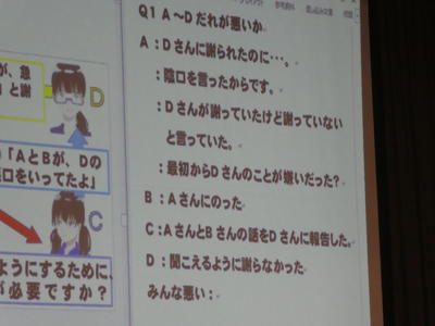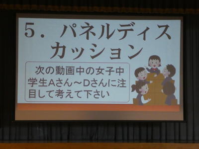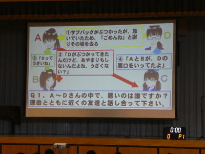 次に、執行部が考えた二中で起こりうるいじめを、事例をもとに全校生でパネルディスカッションを行いました。全校生が近くの人と意見を交換したり、代表生徒の意見を聞いたりすることでいじめに関する考えを深めました。
