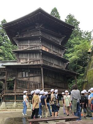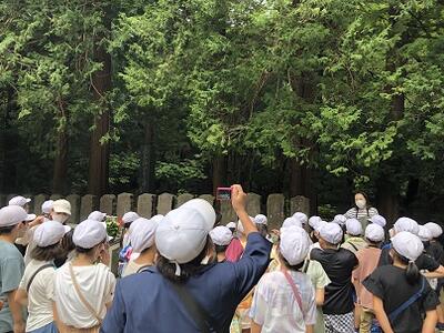 飯盛山です。飯盛山には、白虎隊の隊員が眠るお墓があります。また、らせん状階段の「ささぜ堂」もあります。さざえ堂に入って上がっていくと、いつの間にか元へ戻ってしまうという不思議な建物で、子どもたちはびっくりしていました。