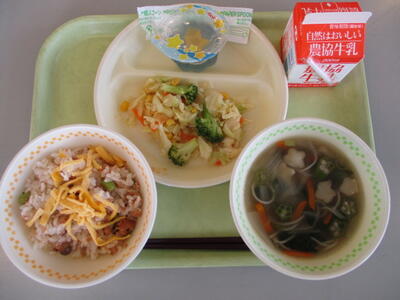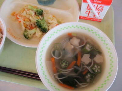 主食には,鮭やしめじ,枝豆を酢めしに混ぜ合わせた「鮭ちらし」。アクセントに刻んだ青じそが入っています。汁物には,天の川をイメージしたそうめん汁。「オクラは苦手だけど、薄く切ってあるから食べられた!」と話していた子がいました!みなさんの願いがかなうように調理員さんたちが一生懸命作りました☆