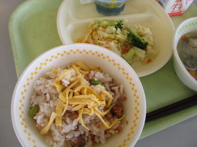 今日の献立は,「鮭ちらし・牛乳・和風サラダ・そうめん汁・七夕デザート」でした。明日の七夕を前に,今日は七夕献立でした。