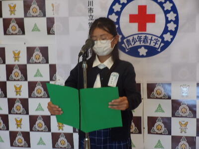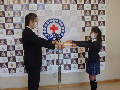 三小タイムで「JRCワッペン授与式」を行いました。全校生を代表しボランティア委員会委員長の伊藤結菜さんがワッペンを受けとりました。JRC(青少年赤十字)では,「健康・安全,奉仕,国際理解・親善」を実践目標としています。本校では,そのJRCの目標を受け「気づき,考え,実行」する児童の育成を目指しています。