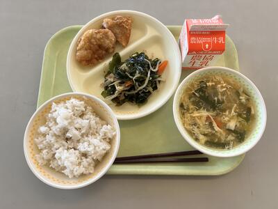 今日の給食は,「鶏肉のから揚げ・もやしとわかめの和え物・にら玉汁・麦ごはん」でした。「学校給食の○○○って,なんで美味しいんだろ?」と思ったことがあるのではないでしょうか。その1つが,今日のメニューの「鶏のから揚げ」です。う~~~ん,絶品でした!