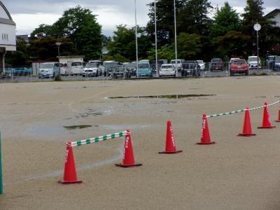 第三小学校の12時半現在の校庭の様子です。現在,小学校では雨がやんでいます。今夜から明日のお昼ごろまでは曇りの予報が出ています。このまま降らなければ,水はけの素晴らしい三小校庭なので,明日の運動会の開催については,期待をしたいところです!