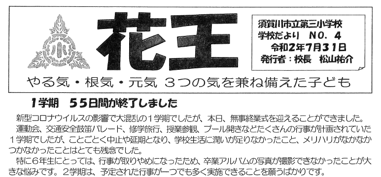 今学期は、新型コロナウィルスにより55日間に短縮された1学期でしたが、無事に終了することができました。保護者の皆さま、地域の皆さま、ご支援・ご協力ありがとうございました。