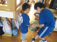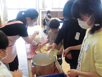 重い食器を一緒に片付けてあげたり、配膳台をふいてあげたりと1年生を応援しています。