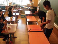 6年生は、1年生の給食の片づけを当番ごとに行っています。