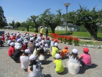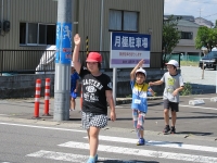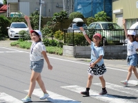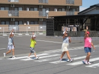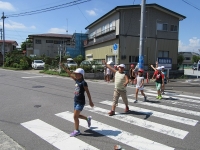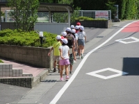 グループに分かれ,学校の周辺を歩きながら交通ルールを確認しました。信号や横断歩道のない道路では左右をよく見てわたること,道路を複数人で歩くときには,道路のはしを1列で歩くことなどに気をつけました。