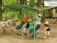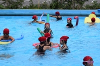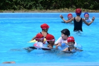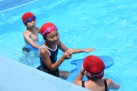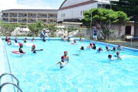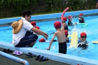 「プカプカポール」というプール遊び用の用具やビート板を使って,子どもたちは元気に水とふれあっています。遊びながら水に親しんだり,泳ぎの練習をしたりと,一人ひとりが思い思いの時間を過ごしていました。