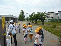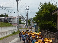 2回目の通学路探検は,和田池方面です。東公民館まで安全に気をつけて歩くことができました。途中,危険な場所を知らせる看板に気づいたり,梨畑を見つけたりする子もいました。また,押しボタン式の信号機のある横断歩道を渡る学習もすることができました。