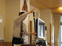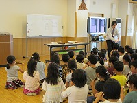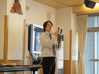 東京リコーダー協会の下中拓哉先生がおこしになり、様々な大きさのリコーダーを見せてくださいました。実際に音を聴き音の高さを聴き比べ、音色の違いを楽しみました。ルパン三世やディズニー、名探偵コナンなど子どもたちが好きな曲をたくさん演奏してくださり、手拍子をしながら楽しみました。リコーダーを演奏する上での息の入れ方など、基本的なことを教えていただきました。