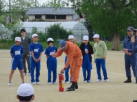 消火器訓練では、児童代表として6年生が実際に消火器を使って模擬消火活動を行いました。