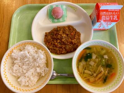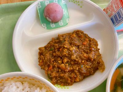 今日のドライカレーは、「米粉のカレールウ」を使用しました。甘味があり、乳・卵不使用で、多くの食物アレルギーに対応できるカレーです。また、ドライカレーには野菜の他にひきわり大豆も使われています。暑い1日でしたが、栄養たっぷりのドライカレーをご飯にのせて、しっかりと給食を食べることができました。
