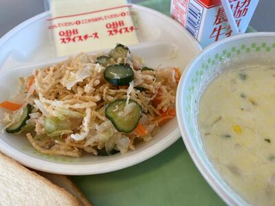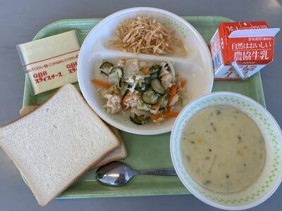 今日の献立は、食パン、牛乳、パリパリサラダ、コーンシチュー、スライスチーズでした。