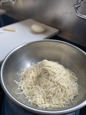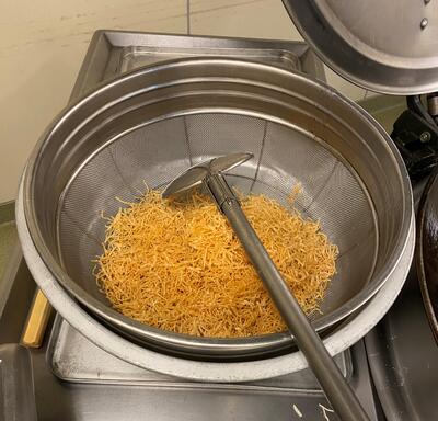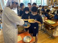 新メニューの「パリパリサラダ」。パリパリの正体は「餃子の皮」。千切りにした餃子の皮を給食室で揚げて、教室でサラダにかけて完成させました。サラダのドレッシングは、おろししょうがを加えて一度煮立たせています。パリパリとした食感と香ばしさで野菜が苦手な人も完食できたようです。