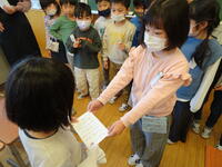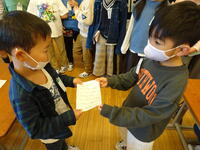 2年生が1年生に、あさがおの種をプレゼントしました。「学校には楽しい勉強や集会があるよ。」「休み時間には一緒に遊びましょう。」などメッセージを伝えていました。きれいな色のあさがおが咲くといいですね。