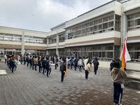 体育館が改修工事で使用できないため、中庭で鼓笛発表を行いました。