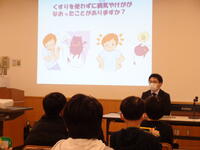 6年生の体育科、保健学習の一環として、アイランド薬局の薬剤師、水沼さんにお越しいただき、薬物乱用防止教室が行われました。正しい薬の処方の仕方やドラッグ等の危険性についてのお話をしていただきました。学習のまとめ時には、悪い誘いに乗らないようにするには、どうしたらよいかを真剣に考えることができました。また、厚生労働省・文部科学省発行の薬物乱用防止に関するパンフレットをお子さんに配付しました。御家庭でもぜひ、お子さんと目を通していただけるとありがたいです。