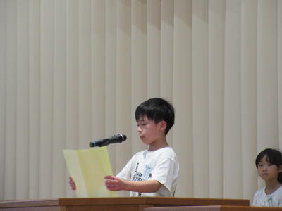 代表児童3名による作文発表。1学期の反省と夏休みや2学期の目標について立派に発表しました。